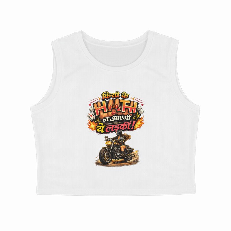 Show your fearless attitude with the “Kisi Ke Haath Na Aayegi Ye Ladki” Graphic Tank Top by Old Masala Tee. Featuring a bold Hindi quote with a powerful motorcycle graphic, this tee represents independence, confidence, and unstoppable style.